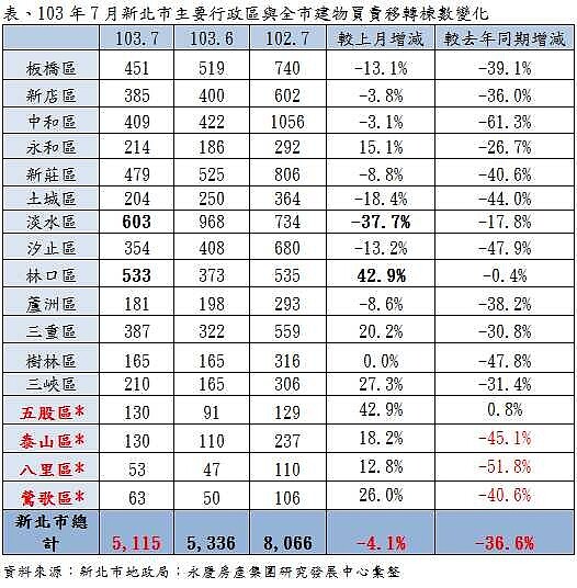 據統計,7月新北市建物買賣移轉量月減4.1%,交易量減少最明顯的區域為淡水區月減365戶,增加最明顯的區域為林口區月增160戶,分別受到新屋過戶因素減少或增加,使交易量呈現明顯的落差。